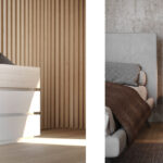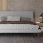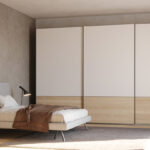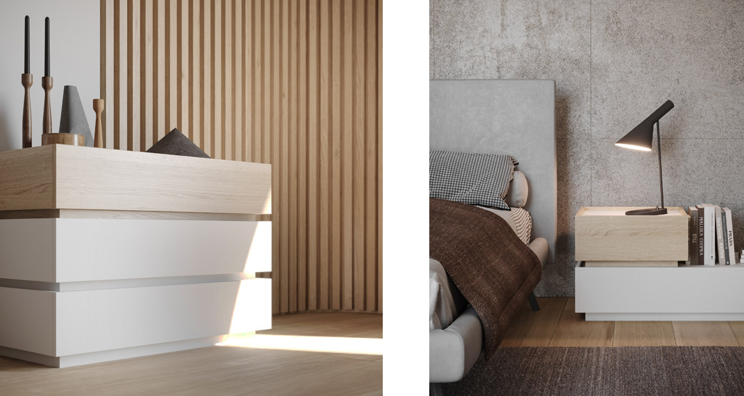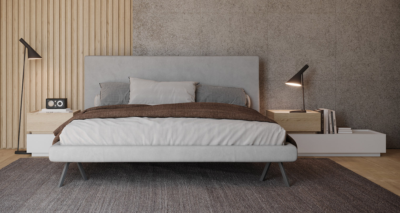 Una proposta che interpreta con equilibrio il dialogo tra superfici materiche e finiture luminose. L’armadio a tre ante scorrevoli presenta una parte superiore in finitura laccato opaco Bianco e una parte inferiore in nobilitato Rovere nodato, incorniciate da un telaio in finitura Ardesia, per un effetto grafico elegante e contemporaneo. Il letto, rivestito in tessuto jeansato, esprime comfort e personalità attraverso la sua presenza morbida e accogliente. Il comodino e il comò, entrambi combinati in laccato opaco Bianco e nobilitato Rovere nodato, completano l’ambiente notte con coerenza estetica e funzionalità.