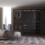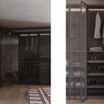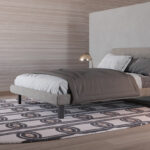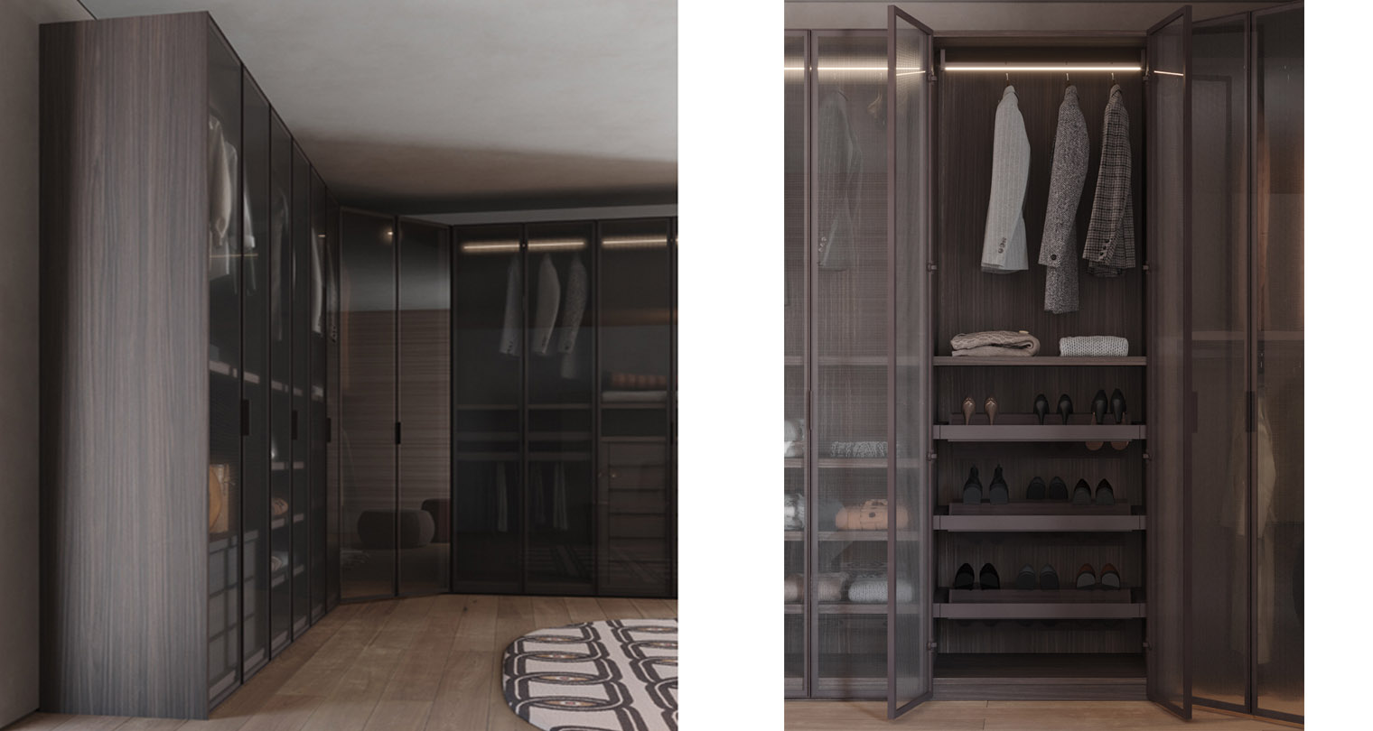 Linee essenziali e materiali caldi si incontrano in una zona notte dallo stile naturale ed elegante. L’armadio, caratterizzato da una finitura in nobilitato Teak, è arricchito da ante in vetro che giocano con la luce e la trasparenza, incorniciate da un solido telaio in finitura Brown, per un effetto raffinato e contemporaneo. Il letto, rivestito in tessuto felpato dalla texture morbida e avvolgente, poggia su piedini in tinta Brown che ne esaltano la leggerezza visiva. I comodini, in due varianti, completano la composizione: uno interamente in nobilitato Teak per un richiamo materico naturale, l’altro combinato con una finitura esterna in laccato opaco Brown che dialoga armoniosamente con il resto degli elementi. Tutti gli arredi sono componibili e disponibili in tante varianti di colori e finiture diverse.