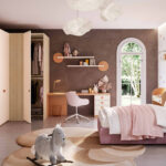Cameretta in legno elegante e raffinata. La scrivania vanity è l’arredo perfetto per chi non vuole rinunciare al rituale della bellezza quotidiano. Finiture: Rovere Nodato, Princess e Terracotta. La linea è pensata per creare ambienti destinati a bambini e ragazzi, rispecchiando la fantasia e la creatività che li contraddistinguono. La flessibilità compositiva e la vasta gamma di colori e finiture garantiscono infinite possibilità di personalizzazione.